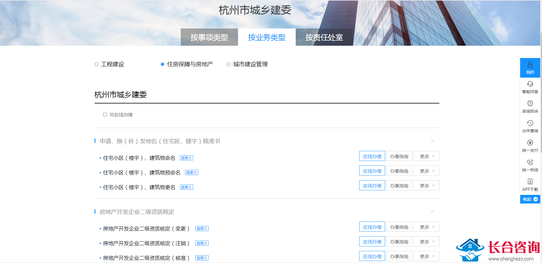 第三步,选择按业务类型按钮,点击房地产开发企业二级资质核定(核准)在线办理按钮,按照提示上传承诺材料即可办理。
